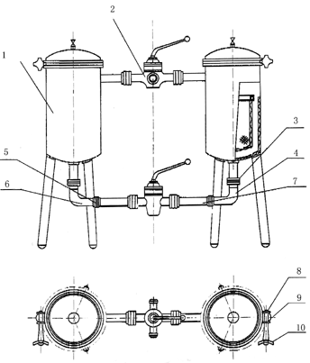1、φ300過濾器 2、三通外螺紋旋塞 3、圓螺母 4、直角彎管 5、光接頭 6、螺紋接頭 7、管子 8、棱形螺母 9、接緊螺栓 10、手柄 |
